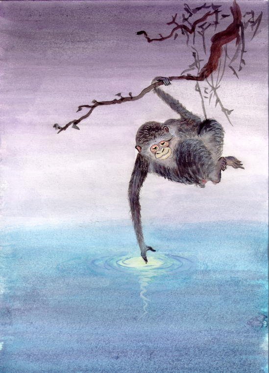 . A monkey hanging from a branch reaches for a reflection of the moon.