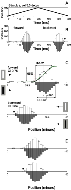 Estimation of width, location and spatial overlap of INC and DEC ARs with sweeping bars. Complex cell 18602, INCw 26 minarc, DECw 28 minarc, CRF 31 minarc, mapping bar 4 minarc wide. A: Position of the bar vs time as it is swept forward across the CRF and back at 5.5?/s. B: PSTHs of the responses in two directions of motion from several repetitions of the stimulus. Data were collected while compensating for changes in fixational eye position (Snodderly and Gur, 1995) and epochs perturbed by saccades were excluded (See Methods). Upward histograms with light bars represent INC responses and downward histograms with dark bars represent DEC responses. C: Same histograms as in B, converted to spatial dimensions with spatial position defined as the product of time and the velocity of the stimulus. The estimation of AR borders for the INC AR is illustrated for the forward (preferred) direction in the upper half of panel C. The cumulative curve for the number of spikes fired is shown, along with dashed vertical lines that denote the intersections of least-squares lines fitted to the cumulative curve. Solid vertical lines represent AR borders as defined by 95% of the response between the intersections, distributed symmetrically around the center of mass. The same process (not shown) was carried out to define the DEC AR. The separation between the INC and the DEC centers (sep) was used to calculate the overlap index, OI. Note that the space histograms for backward motion (lower half of panel C) are left-right reversed with respect to their time counterpart in B, to reflect the actual spatial arrangement of the responses. The right (trailing) edge in time, denoted by the asterisk, is the left (leading) edge in space. The relative locations of INC and DEC ARs differ slightly in the forward and backward directions, due to small differences between INC and DEC response latencies (see Results). Establishing the absolute position of the receptive field in the two directions requires taking the response latency into account, which is done in panel D. Correcting for the INC latency of 44 ms and the DEC latency of 55 ms for this cell shifts the histogram for forward motion to the left and the histogram for backward motion to the right, so that the estimate of spatial location of the ARs is consistent for the two directions. From [1]